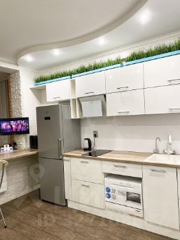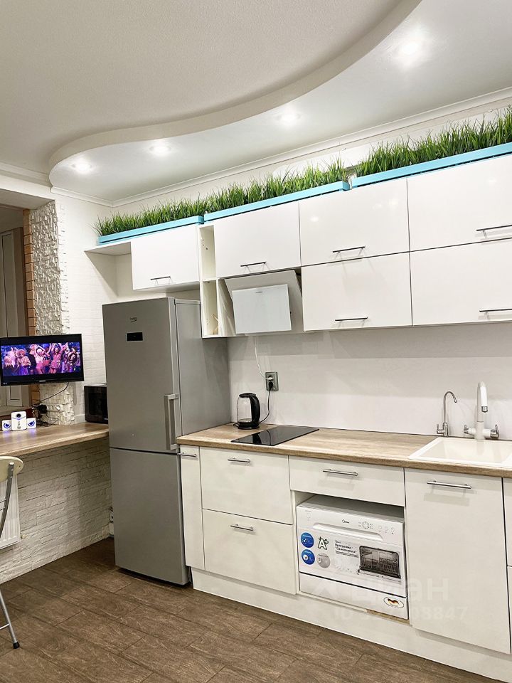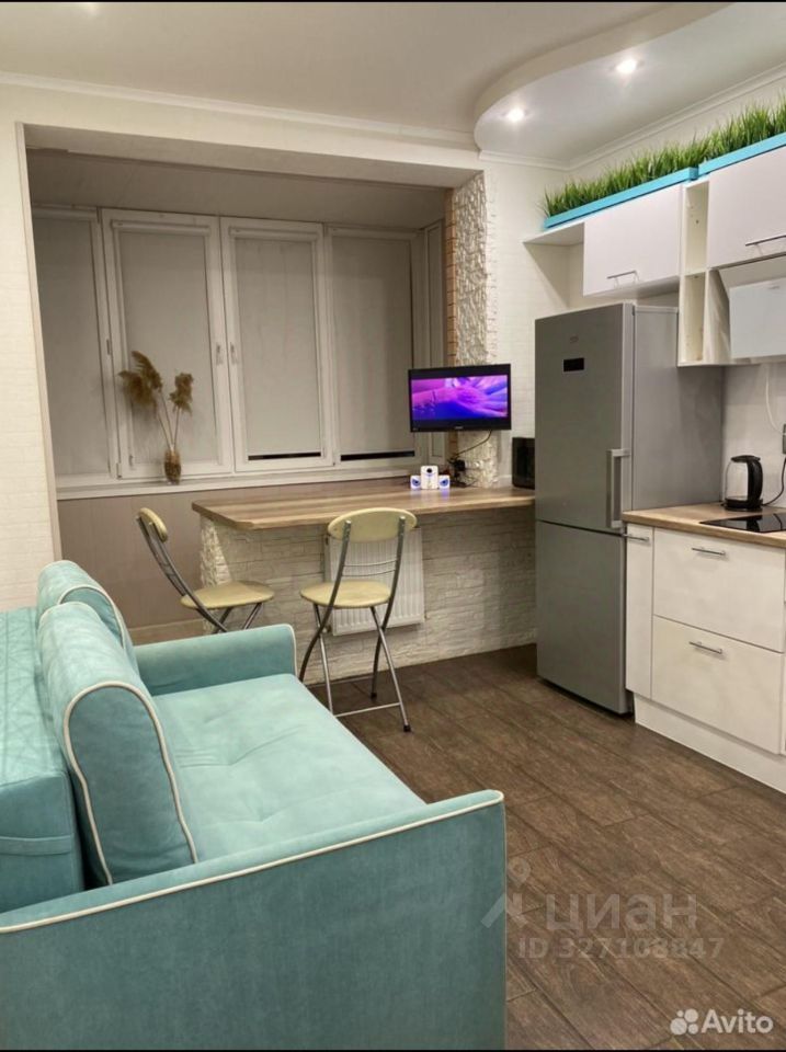 Кухня-гостиная с раскладным диваном, зеркальным панно и телевизором. Из техники имеется: индукционная варочная панель на две конфорки, холодильник, микроволновая печь, посудомоечная машина, увлажнитель. Установлен 5ти ступенчатый дорогой фильтр для чистой питьевой воды (можно пить деткам с рождения).