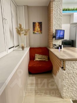 Лоджия на восемь оконных пролётов имеет выход на комнату и кухню, на балконе со стороны кухни стоит раскладное кресло-кровать, со стороны комнаты стеллаж для хранения.