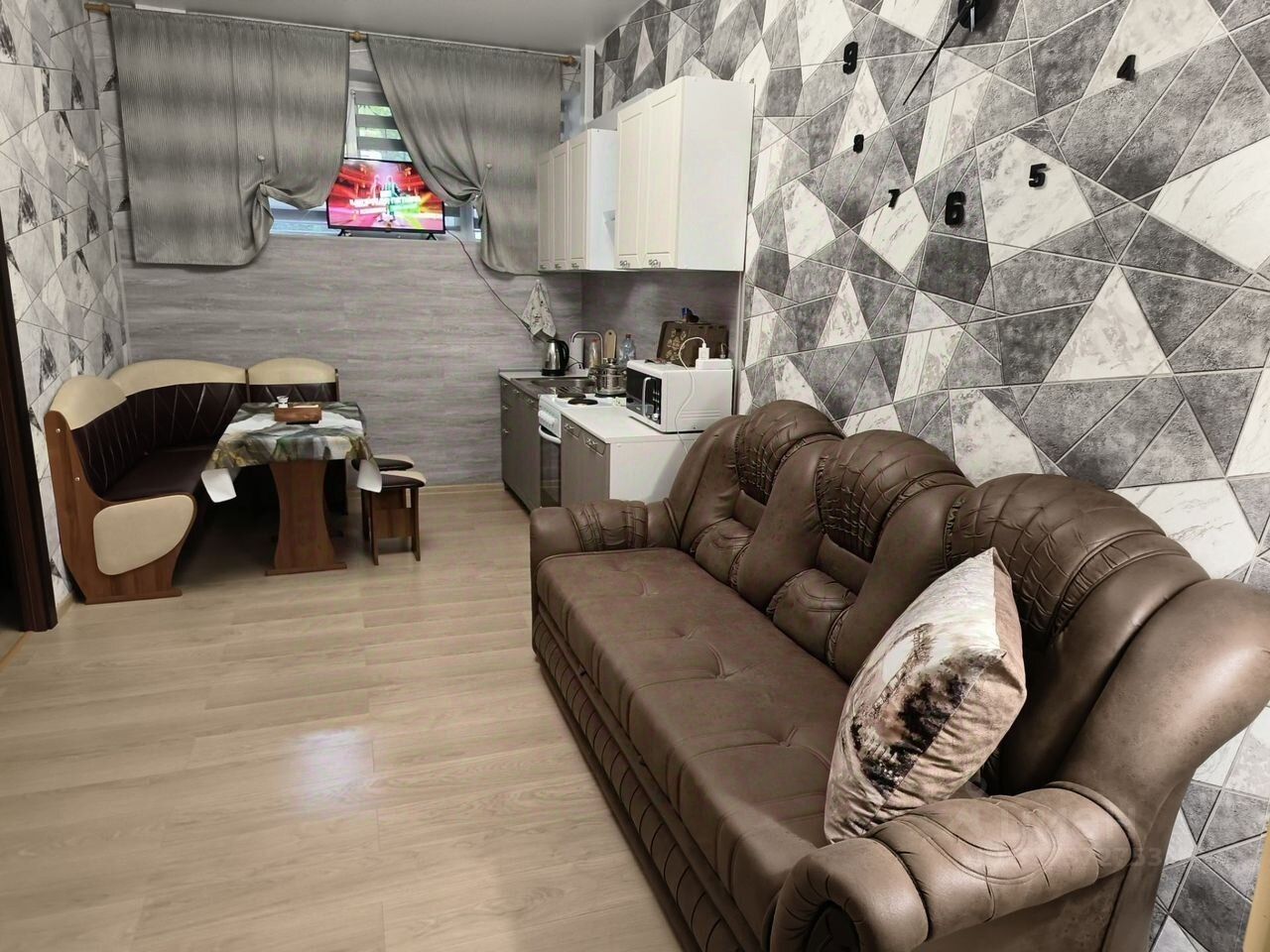 Кухня совмещена с комнатой отдыха. Большой кожаный диван, ТВ и все что требуется для комфортного проживания.