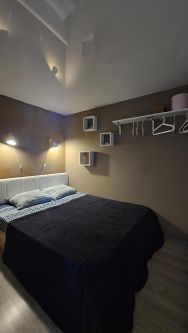 Внутри вы найдёте всё необходимое для комфортного проживания: холодильник, стиральную машину, телевизор с кабельным/цифровым ТВ, а также уютную мебель — шкаф, кровать с системой хранения, диван и гримерный столик.