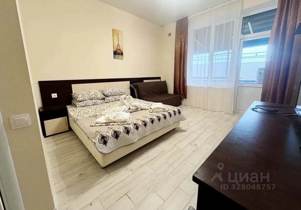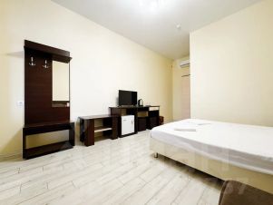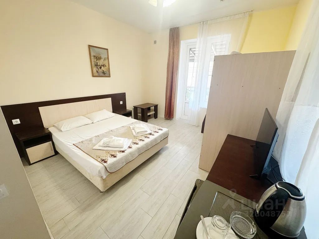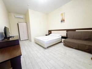 Четырехместный номер с двухспальной кроватью и раскладным диваном кроватью рассчитанным на двоих взрослых. Номер с выходом на общую большую террасу оборудованную мебелью. В номере чайник., холодильник, кондиционер, телевизор.