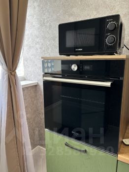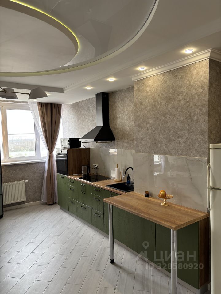 Большая кухня оборудована современной техникой: холодильником, плитой, микроволновой печью и вытяжкой. Из окон открывается приятный вид на городские пейзажи.