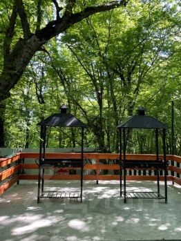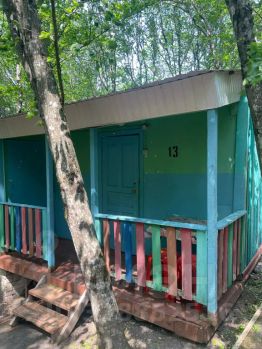 Уютный домик площадью 10 м² с террасой 3 м². Внутри: две односпальные кровати, вентилятор,тумбочки, холодильник. Душ и туалет — в современном общем блоке (4 душевые кабинки, 2 унитаза и 2 напольные чаши). Для гостей также доступны: парковка, мангальная зона, WiFi и общая кухня с газовыми плитами и посудой.