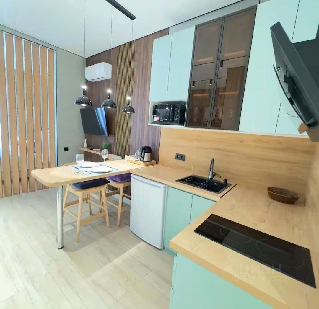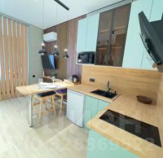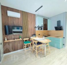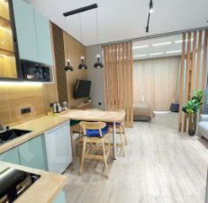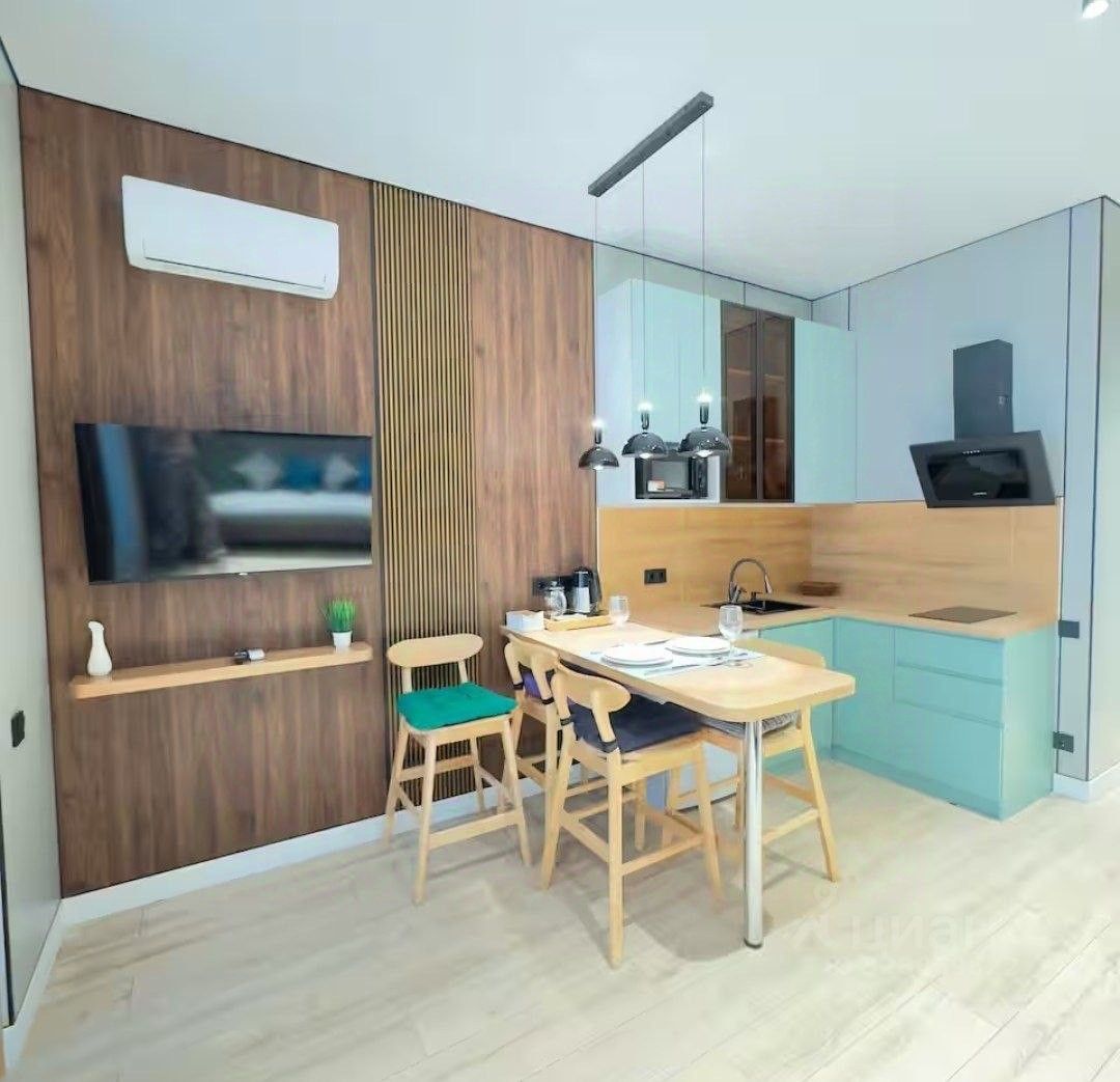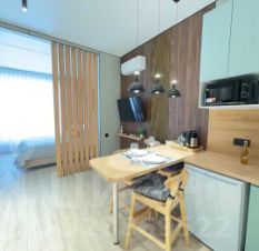 Квартира выполнена в формате студии и находится в хорошем состоянии. В ней имеется одна лоджия, а также совмещенный санузел. В квартире есть вся необходимая техника: холодильник, телевизор, стиральная машина, кондиционер и интернет.