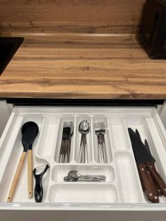 Белая встроенная кухня. Техника. Посуда.