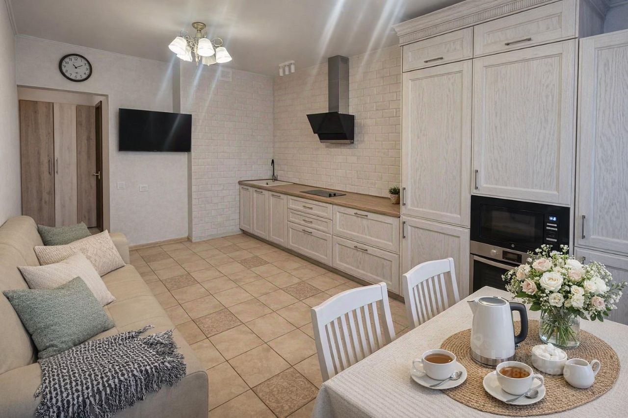 Квартира уютная, светлая, с красивым дизайнерским ремонтом. Есть всё необходимое для комфортного проживания: кухня полностью укомплектована техникой - плита, духовой шкаф, микроволновая печь, посудомоечная машина. В квартире есть удобные спальные места, отдельная детская комната, продуманное пространство для семьи.