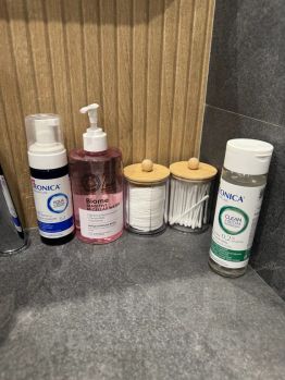 - Гигиенические принадлежности (шампунь, бальзам, гель для душа, мицелярная вода, тоник, пенка для умывания)