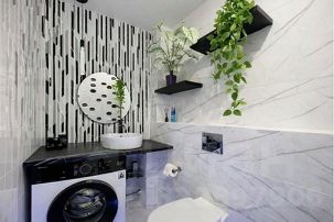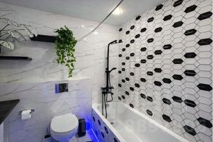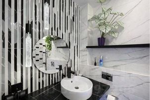 стильная плитка, подсветка, зеркало, аккуратные детали