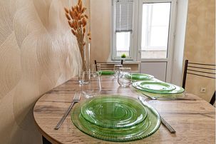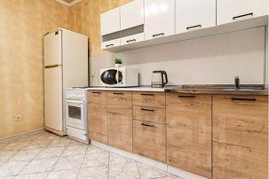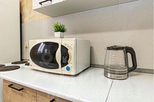 кухня оснащена посудой, приборы для приготовления и приёма пищи, холодильник, плита, электрический чайник