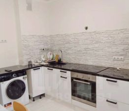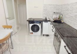 Кухня оснащена всем необходимым: современная плита, холодильник и стиральная машина, обеденный стол, три стула, микроволновка, электрочайник, посуда.