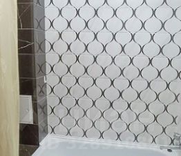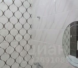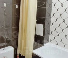 Санузел совмещенный, оформлен стильными плитками и оснащен ванной, ковриками, шторкой.