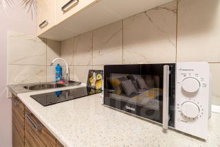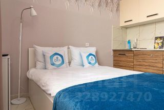 Апартаменты рассчитаны на 2 гостей. В апартаментах: двуспальная кровать, кондиционер, кухонная зона, холодильник, стол, стулья, душ, раковина, туалет.