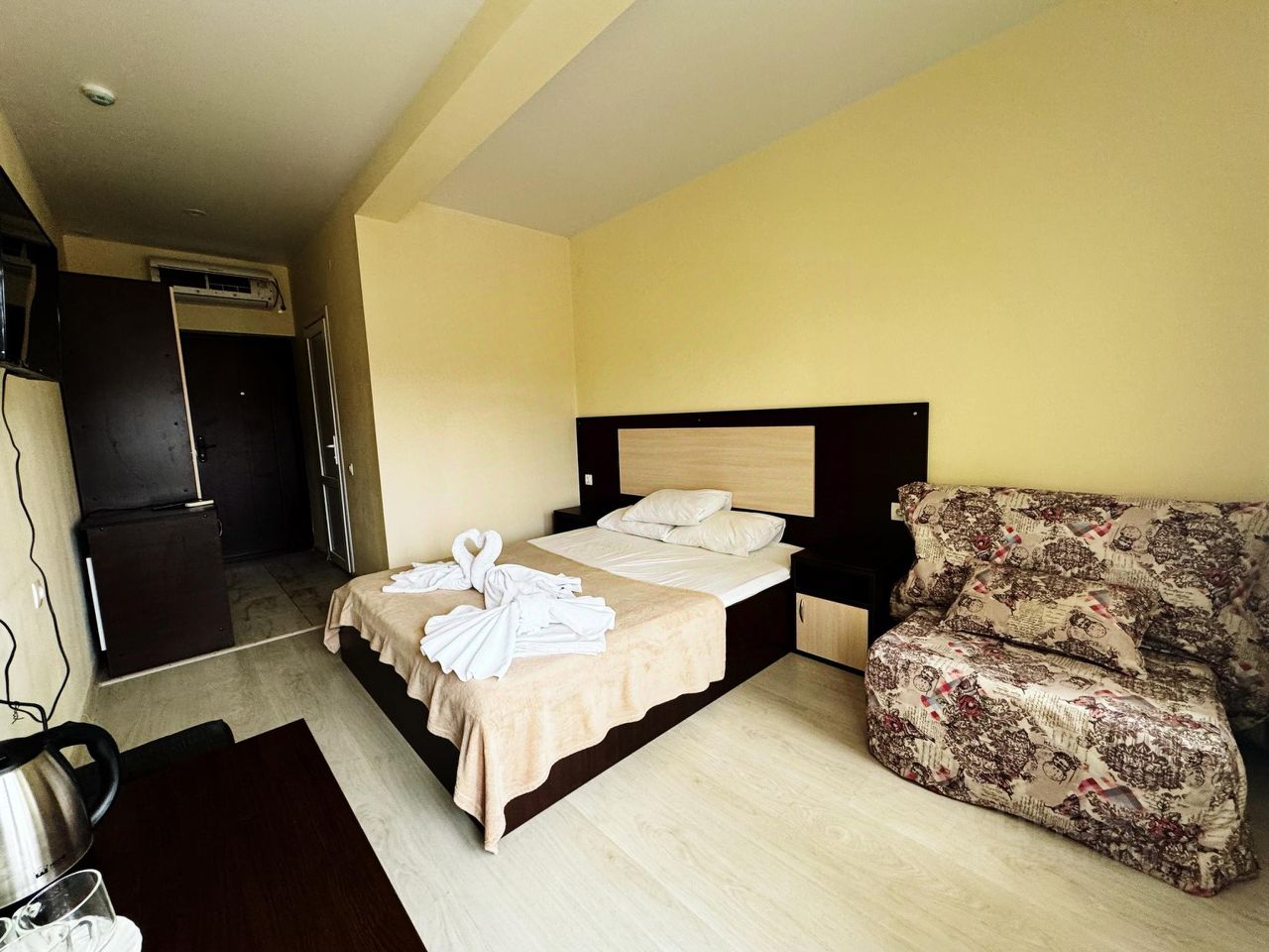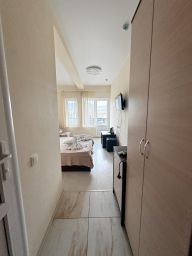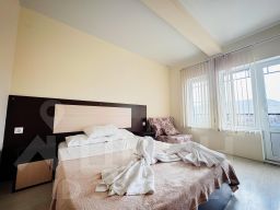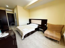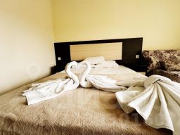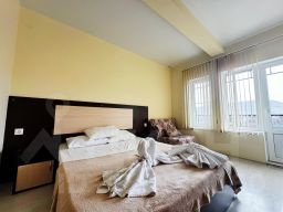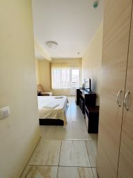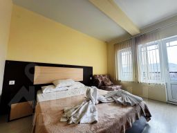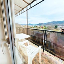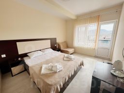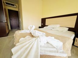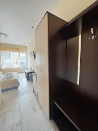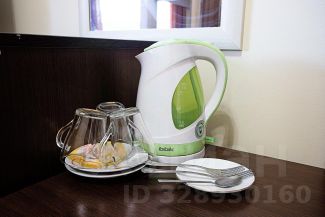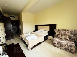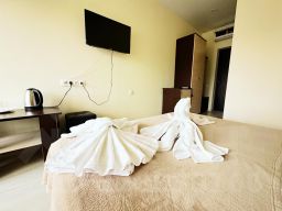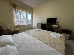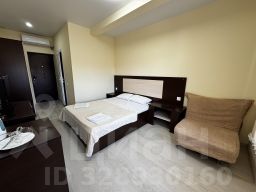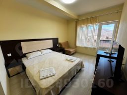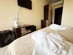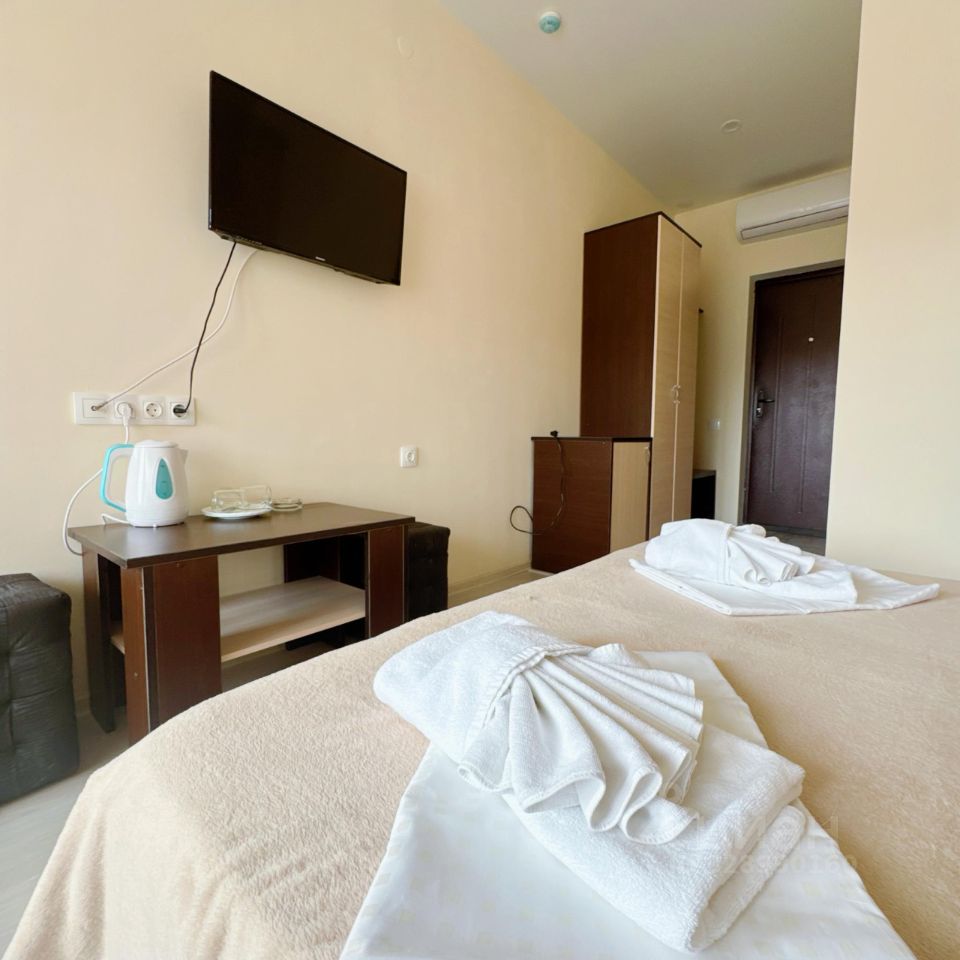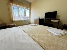 Номер оснащен всей необходимой мебелью. Также в номере имеется душевая комната, установлены сплит-система, телевизор, холодильник, электрочайник. На балконе стоит стол и стулья