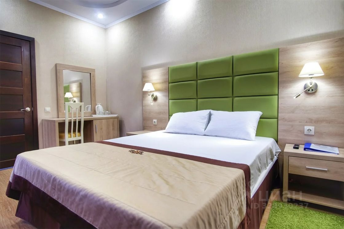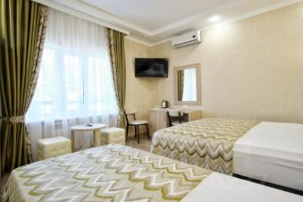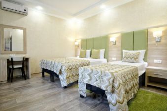 В номере: одна двухспальная кровать 160х200 и одна односпальная кровать 80х200 или раскладной диван 120х200, прикроватные тумбы, жк телевизор, стол, стулья, зеркало, бельевой шкаф, вешалка для одежды, холодильник, сплит-система, чайник, стаканы, постельное белье, полотенца, халаты, тапочки, фен, жидкое мыло, гель для душа, шампунь, туалетная бумага.