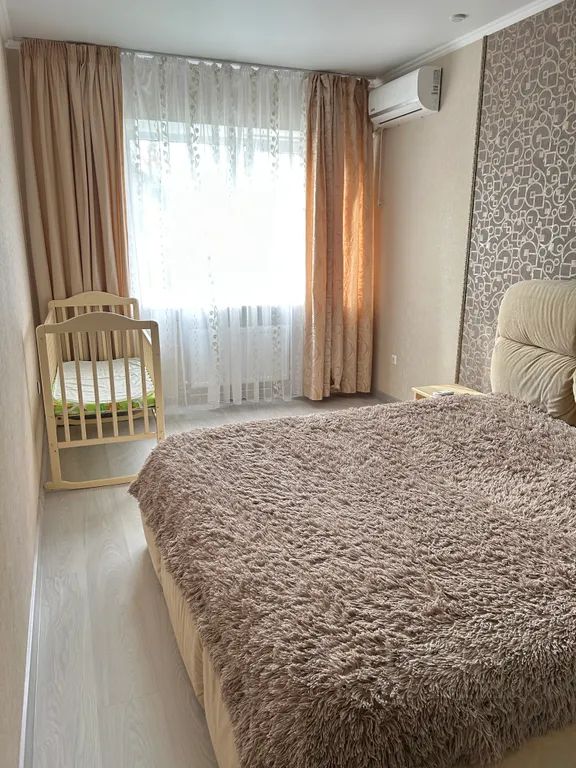 В квартире две комнаты, в спальне двуспальная кровать евро, в зале раскладывается двухместный диван + пуф и можно уложить ребенка!