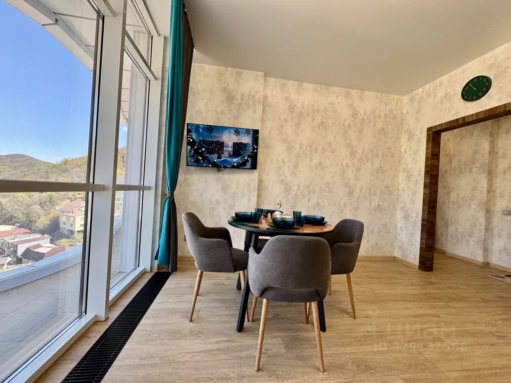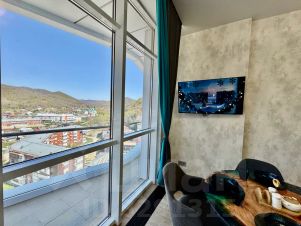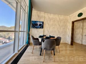 Планировка продумана: изолированная спальня с телевизором и прекрасным видом на горы из окна. Кухня-гостиная оборудована большим диваном и обеденным столом на четыре персоны. Из зоны гостиной есть выход на просторный балкон площадью 10 квадратных метров: там расположены два удобных кресла и столик, чтобы приятно отдыхать в любое время суток.
