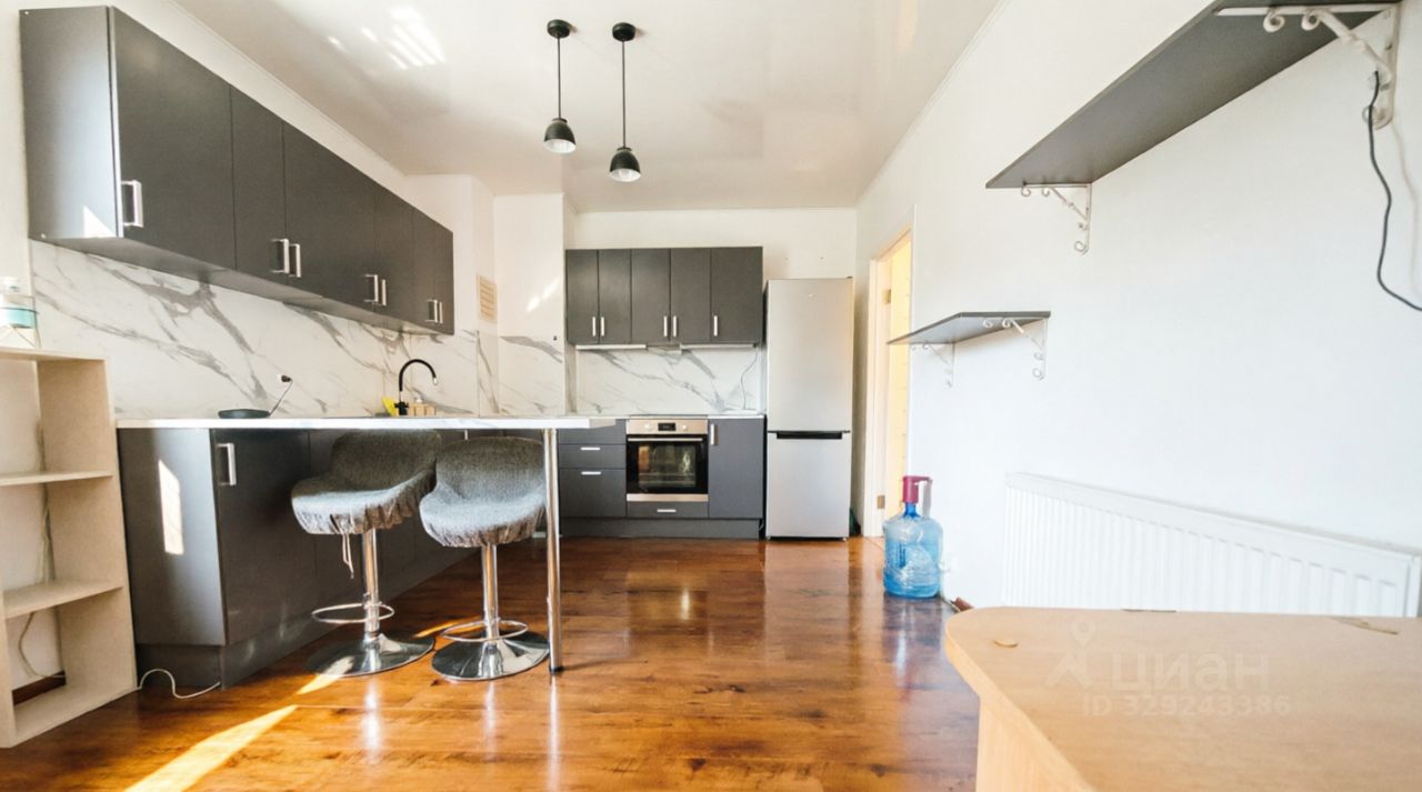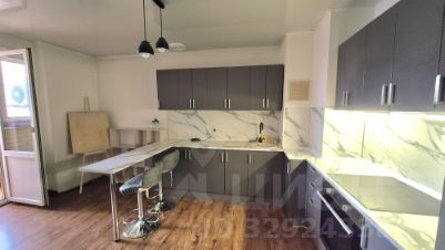 Кухня большая, просторная, с барной стойкой. Фартук под мрамор, тёмные матовые фасады, встроенный духовой шкаф, холодильник, варочная панель. Много естественного света, тёплый деревянный пол, стильные подвесные светильники.