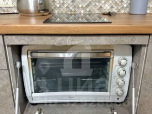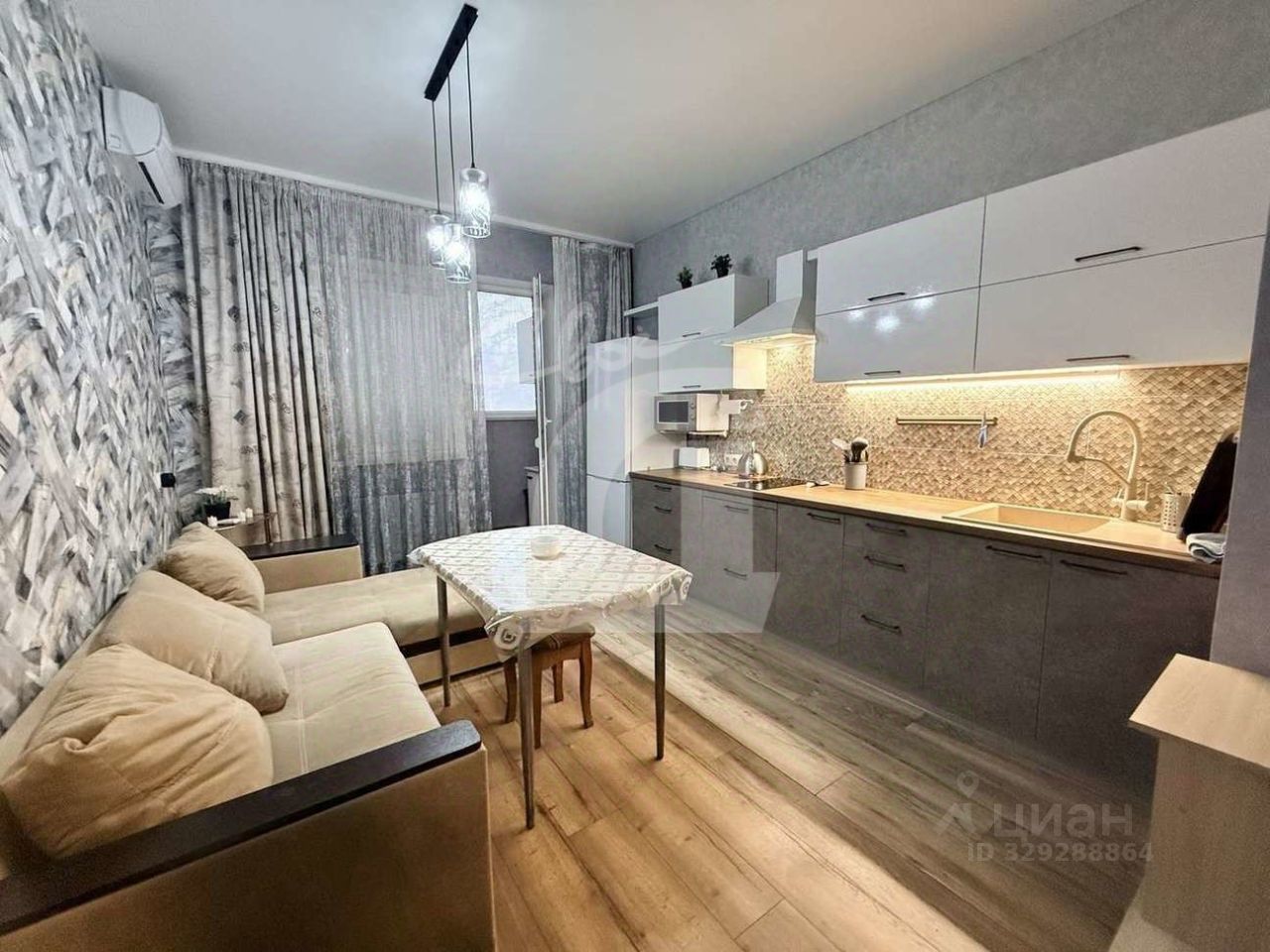Кухонный гарнитур со встроенной техникой( духовой шкаф, индукционная плита, холодильник, вытяжка, мкроволновка, тостер, чайник) . Диван, стол , большой ТВ , сплит.