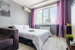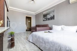 В комнате имеется два спальных места: двуспальная кровать и раскладной диван, доступно размещение до 4 гостей.