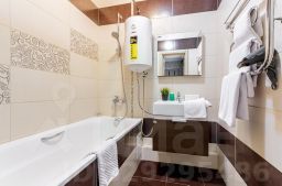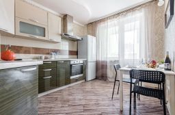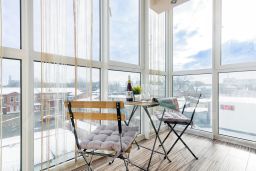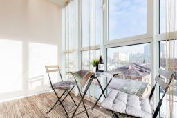 Апартаменты располагаются в новом 16 этажном монолит-кирпичном доме на 4 этаже. У дома охраняемая и огороженная территория, въезд на территорию через шлагбаум. В апартаментах есть терраса с панорамным остеклением, где стоит столик и 2 стула, на террасе сделан теплый пол.