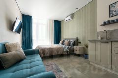 В квартире есть всё необходимое для комфортного проживания. Здесь установлена современная мебель как в комнате, так и на кухне. Санузел совмещённый, оборудован ванной. Вас порадует наличие всей необходимой техники: кондиционер, холодильник, телевизор и стиральная машина. Балкон — отличное место для утреннего кофе или вечернего отдыха.
