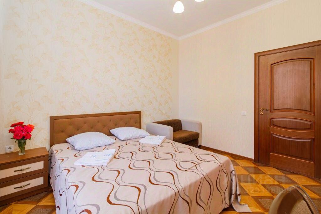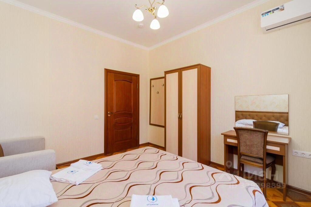 Мебель: большая двуспальная кровать, диван большой, диван раскладной маленький, шкаф, прикроватные тумбочки, стол, вешалка. Санузел в номере