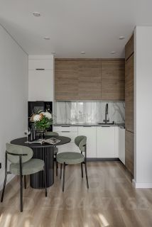 В зоне кухни есть вся необходимая техника, всё встроенное : холодильник, посудомоечная машина, духовой шкаф. Индукция варочная панель, вытяжка, СВЧ. Комплекты посуды и приборов. Зона обеденного стола с удобными мягкими стульями.
