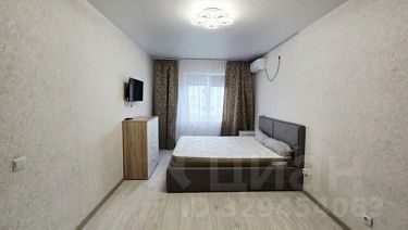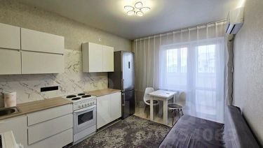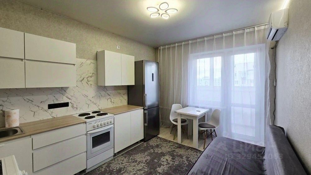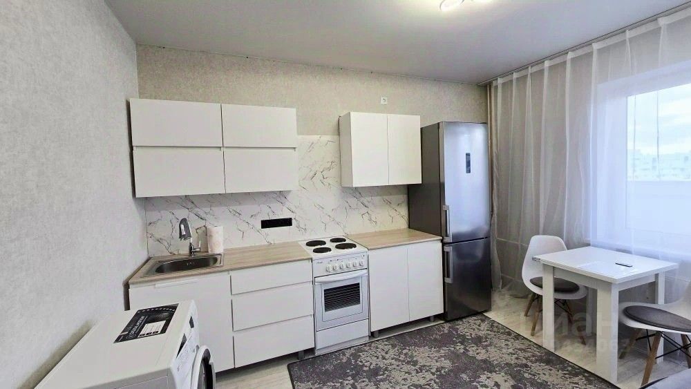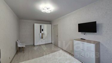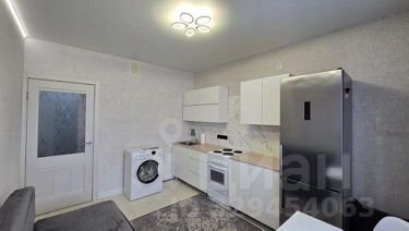 В квартире выполнен свежий евро ремонт. Просторная комната оборудована шкафами и телевизором. Из мебели также имеется удобный диван и обеденный стол. Кухня оснащена современной бытовой техникой, включая холодильник и стиральную машину.