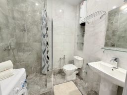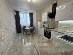 В квартире выполнен качественный евроремонт. Просторная кухня площадью 15 кв. м оборудована всей необходимой техникой: кондиционером, холодильником, посудомоечной машиной и телевизором. В комнате также есть мебель. В ванной комнате установлена современная душевая кабина. В квартире проведен интернет, поэтому всегда можно оставаться на связи.