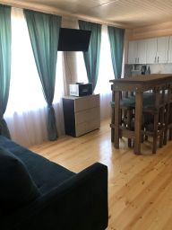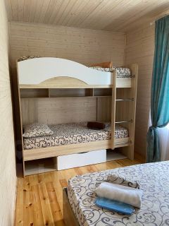 Данный вариант включает в себя Отдельно стоящий коттедж, 10-ти местный с отдельной просторной оборудованной кухней, с двумя изолированными спальнями. В одной спальне: двуспальная и двухъярусная кровати, в другой - двуспальная кровать и двухъярусная кровати, сплит-система. В комнатах: Стол, стулья, шкаф, комод, телевизор, тумба, сплит-система. Кухня=гостиная: двуспальный раскладной диван, кухонная зона, зона столовой. Собственная, укомплектованная мебелью, беседка