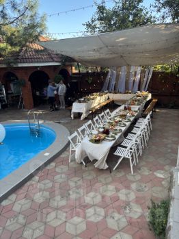 Беседка-шатёр у бассейна охлаждается туманом с большим столом на 35 чел - можем оформить и сервировать для Вас как на фото. Или + стол на 10-12 чел.