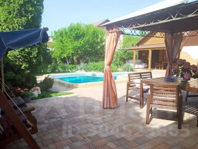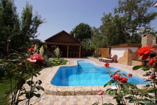 Во дворе много экзотической растительности, виноградная беседка, бассейн, водопад, клумбы с цветами, площадка для отдыха с барбекю. Дом рассчитан на комфортный отдых семьи или компании от 2 до 6 человек.