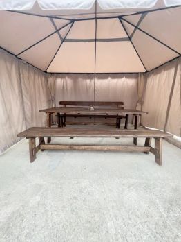 2 беседки вместимостью на 20-22 персоны и вторая на 10 персон (ее удобно использовать для детского стола или для ведущего мероприятий)