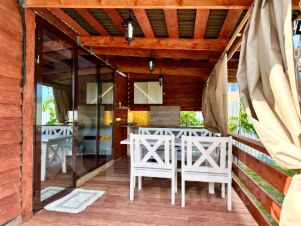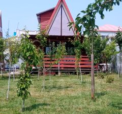 Эко домик афрейн. от1 до 5 .гостей.бронирование начнётся с января. еревянный,двухкомнатный.одна комната на первом этаже. вторая комната на втором этаже.. Большая веранда с уличной мебелью. Мангал отдельный для каждого домика. домики оборудованы по два кондиционера в каждом домике. до моря 10 минут пешком. вид с веранды на фруктовый сад на веранде летняя кухня в каждом домике на участке только два домика для гостей. .откроемся в мае 2026 май 3000году цена за июнь. 3500 _-- 4000 июль 5000 август 6000.сентябрь3000 - 2500.