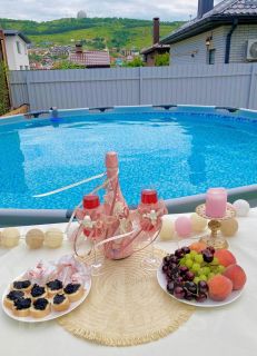 Во дворе обустроена зона отдыха с бассейном и мангалом.