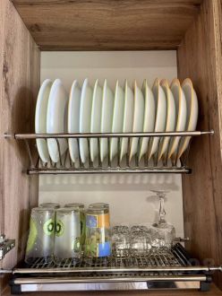 Полностью оборудованная кухня — холодильник, индукционная плита, электрочайник, сплитсистема, посуда, кухонные приборы, полотенца, тряпки, бутыль с пищевой водой, мыло, средство для мытья посуды