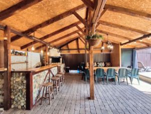 Беседка с мангальной зоной на весь срок пользования баней.Есть мангал, печь под казан, барная стойка, большой стол, теплый бассейн 3*6.
