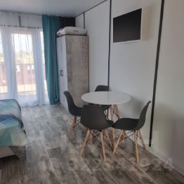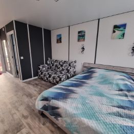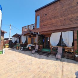 уютная студия на втором этаже, со своей собственной большой террасой, шикарным видом на море и озеро. в студии есть всё необходимое для комфортного проживания. море в двух шагах, недалеко от нас находятся кафе, столовые, магазин. на территории есть каркасный бассейн, качель-кокон, батут, мангальная зона.