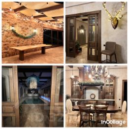 Дом с большой террасой/ небольшим барбекю/уличным столом до 15 персон,обеденная зона кухни,стол на 8 персон,сауна с бассейном ( с подогревом от 29-30 гр ) 2 душевые комнаты,комната отдыха.