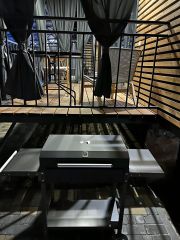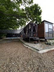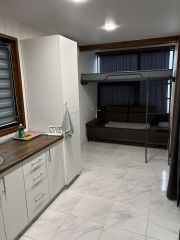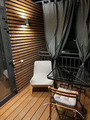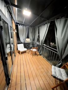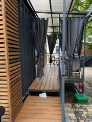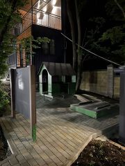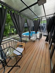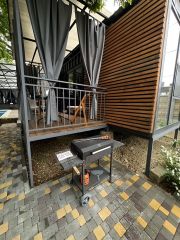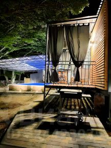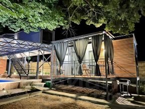 Морской контейнер переделанный в комфортабельный домик, может вместить до 3 человек, в номере диван на двоих, подвесная кровать и жесткая раскладушка (по запросу). Уютная веранда прямо у бассейна, со своим столиком и креслами, веранда может полностью зашториваться. К домику прилагается гриль мангал с принадлежностями, стоит рядом с верандой. Территория гостевого дома находится в настоящем лесу со столетними дубами. За участком течет речка.