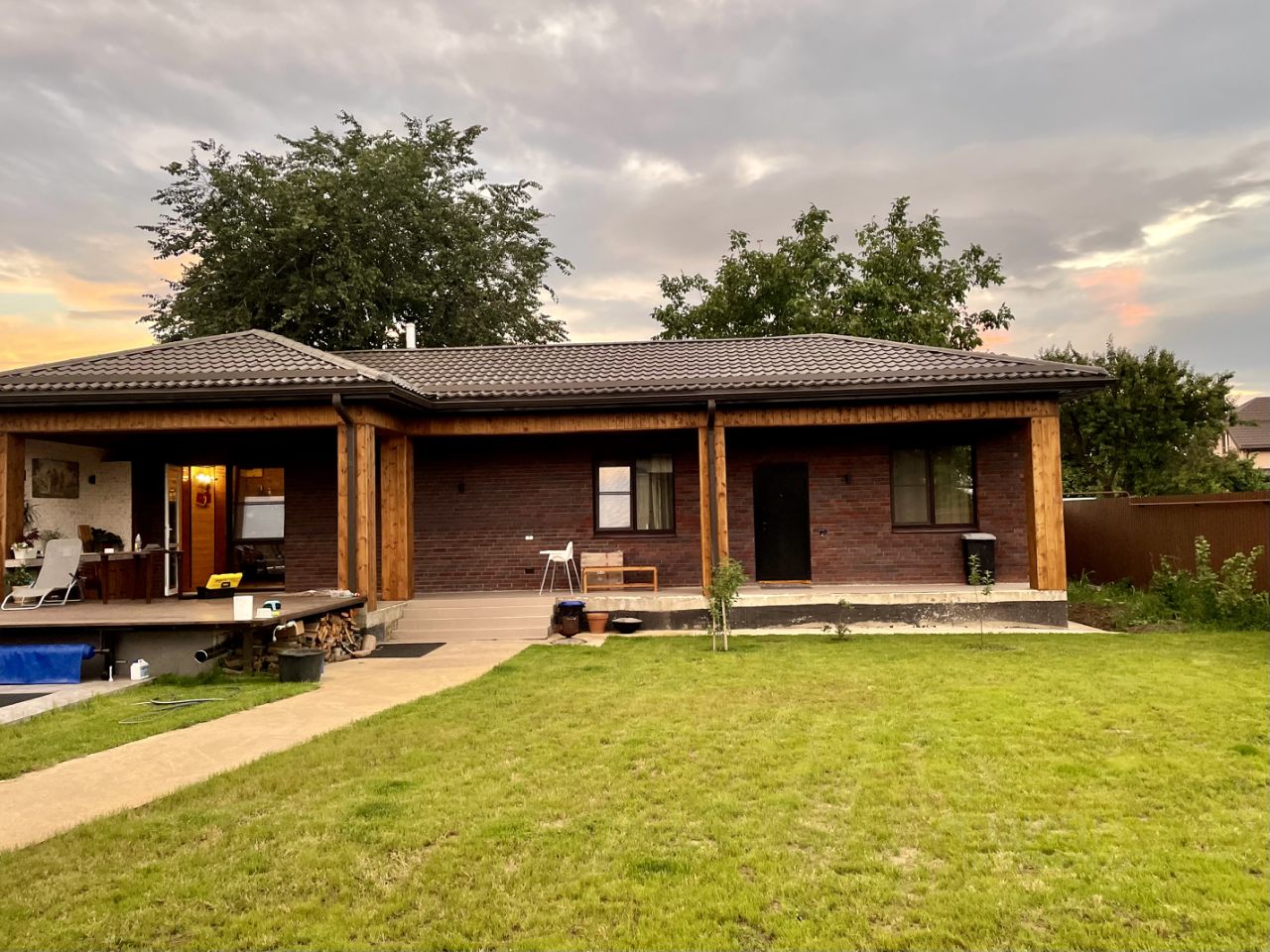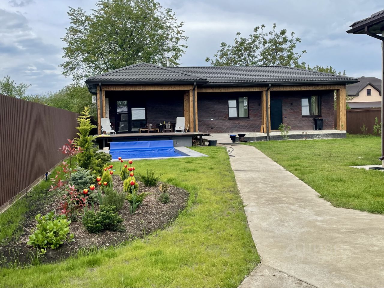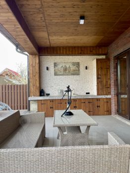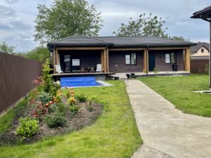 Уютный, кирпичный коттедж с бассейном и баней расположен в конце участка, окружен высоким забором и зеленой изгородью, вокруг газон с удобными дорожками и клумбами. Автоматические ворота и обширное место для парковки автомобиля. Большой, подогреваемый бассейн находится сразу при выходе на террасу, окружен газоном, удобным для игр и приятного отдыха под лучами солнца. Для любителей барбекю - отдельная терраса со всем необходимым. Также небольшой участок земли для любителей свежих овощей.
