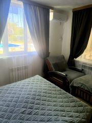 KОМПЛЕКС C БАНЕЙ И БАНHЫМ ЧAНOM, CДAETСЯ СPAЗУ ДBA ДOМА И ТOЛЬКО ДЛЯ BАШEЙ KOМПAHИИ! Пpошу правильнo указывaть количеcтвo гoстeй пpи бронирoвaнии т.к. изнaчaльный paсчет идет зa 2 человeк. БAСCEЙН С ПОДОГРEBОМ, TЕМПEPАTУРA 32-34 ГРАДУСОВ. УСТАНОВЛЕНО ПИВНОЕ ОБОРУДОВАНИЕ. НЕ ДЛЯ ШУМНЫХ ВЕЧЕРИНОК. МУЗЫКА ТОЛЬКО В ФОНОВОМ РЕЖИМЕ. ПОРТАТИВНЫЕ КОЛОНКИ ЗАПРЕЩЕНЫ. Просьба бронировать, если уже определились с выбором. Размер бассейна 5м на 8м, глубина от 1.4 до 2.2 м с стационарной системой очистки. Приглашаем вас в наш небольшой комплекс в 30 км от Краснодара. Мы с радостью примем у себя семьи с детьми, а также небольшие группы друзей, желающих отдохнуть на природе в экологически чистом месте. На нашей территории можно проводить праздники, семинары, мастер-классы, ретриты и любые другие мероприятия. Мы открыты к разному рода сотрудничеству! Комплекс включает в себя: - Один из домов вмещает до 6-х гостей, второй до 5-ти, сдается сразу два дома, в случае бронирования до 6 человек, вы сами выбираете дом, второй дом сдаваться другой компании не будет. На территории вы будете одни. - Закрытая территория где вы будете одни, теплый бассейн, беседка с мангальной зоной и казаном баню на 5-7 человек. - Банный чан на 6 человек. - Огороженная территория 7 соток с местами для парковки и мангальной зоной. Арендуя наш комплекс, вы получаете: чистый воздух и лес вокруг; выход к реке Шебш с пляжем; уютный интерьер со всем необходимым для комфортного проживания: мебель (кровати, диваны, столы, стулья, шкафы и пр.), бытовая техника (чайник, микроволновая печь, холодильник, телевизор, фен и др.), теплые полы в доме; комплекты свежего постельного белья и полотенец; кондиционеры; душевая кабинка в каждом доме и средства гигиены на каждого гостя; бесплатный Wi-fi мангальная зона под навесом со всем необходимым (уголь не предоставляется) За отдельную плату можно снять баню или банный чан. Дрова в необходимом количестве предоставляются. Комфортное количество человек для единовременного нахождения в бане: 5-7 человек. Если вы хотите приехать со своим домашним питомцем, то это возможно. В радиусе 1-3 км от нас находятся: конный клуб: здесь можно заказать фотосессию с конями, конную прогулку на всю семью, а также получить урок верховой езды; продуктовые магазины (Магнит, и другие); небольшие кафешки, пиццерия. При желании вы можете заказать дополнительные услуги: доставка продуктов из магазинов; На территории установлены две камеры, которые видят только общую территорию участка. На время проживания берётся залог за сохранность имущества. ЗАПРЕЩЕНО: курить внутри помещений; запускать фейерверки, конфетки, хлопушки (слишком много мусора); шуметь после 23:00; В доме имеется спальня, санузел, гостиная, холодильник, телевизор, стиральная машина, микроволновка, сплит-система, кухня. На территории имеется беседка 40 кв.м., бассейн ,мангал, казан, русская печь с духовкой и шезлонги. Возможно дневное пребывание.