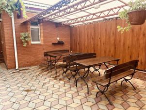 Во дворе два стола с лавками, мангал, набор для барбекю.