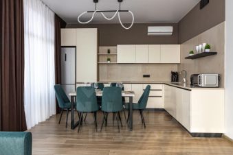 Полноценная кухня со всем необходимым: индукционная плита, микроволновая печь, посудомоечная машина, полный комплект посуды.