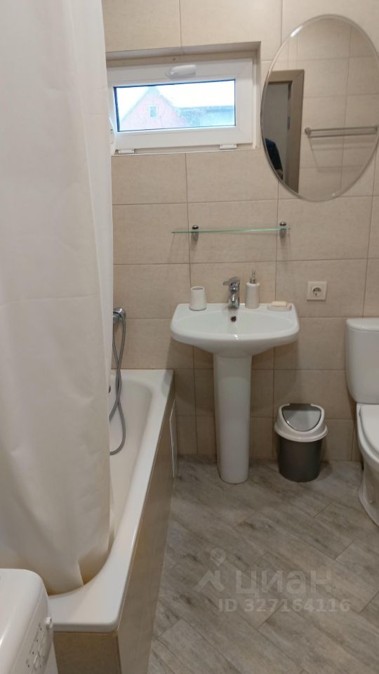 Санузел совмещенный, оформлен в светлых тонах, оснащён ванной и необходимой сантехникой. В кухне установлена современная плита и обеденный стол с четырьмя стульями и мягкими диванами.