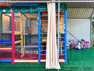 Для маленьких туристов двухуровневая игровая детская площадка, качели, песочница.