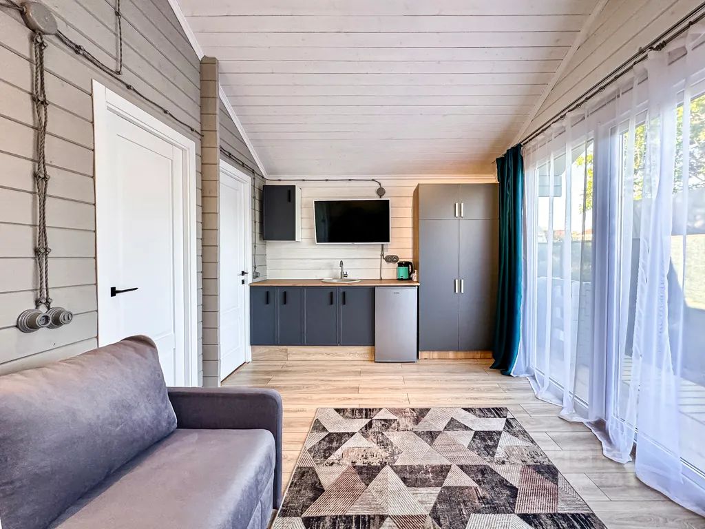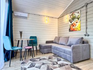 Двухкомнатный: кухня-гостиная, спальня (возможно, две отдельные кровати или одна двуспальная), санузел. На территории работает столовая, завтрак и обед, ужин под заказ. Меню и стоимость уточняем отдельно. В столовой кондиционер, есть возможность после жаркого солнышка пообедать в прохладе.