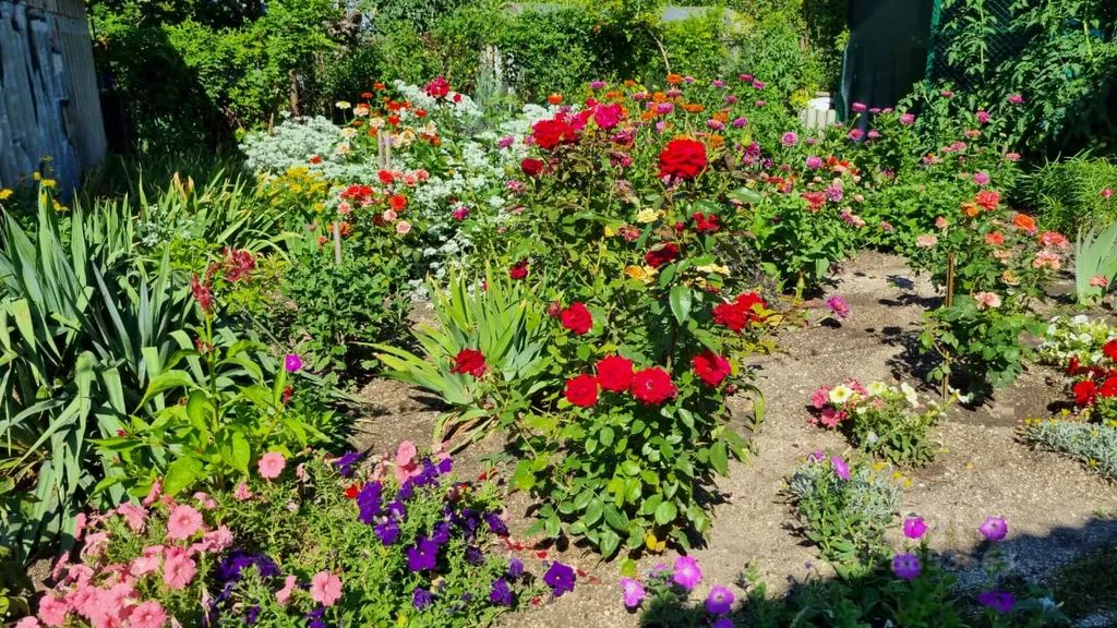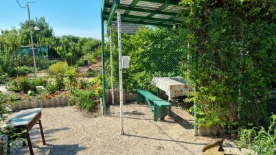 Зелёный двор, столик, место для парковки авто, рядом со двором расположена песочница для детей и лесенка, во дворе качели.