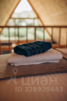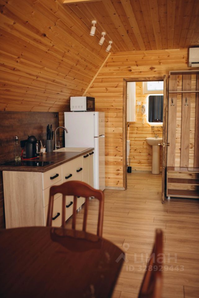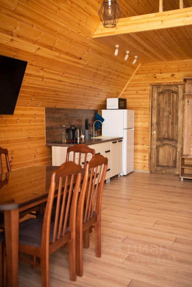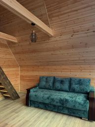 На территории стоит два домика вместимостью 4 и 6 человек. В домах на первом этаже: кухня-гостиная и санузел, на втором этаже: спальня. На кухне есть вся необходимая посуда для приготовления еды и сервировки стола. А также: соль, перец, сахар, подсолнечное масло и зубочистки. К каждому домику предоставляется беседка с мангальной зоной и резной мебелью. Возле 6 местного домика на террасе установлен банный чан фурако.