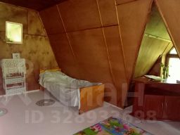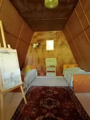 В домике два этажа, гостиная с двуспальным диваном, кухОнная зона, спальня наверху в мансарде( больше подходит для детей и подростков) , санузел, душ в доме.
